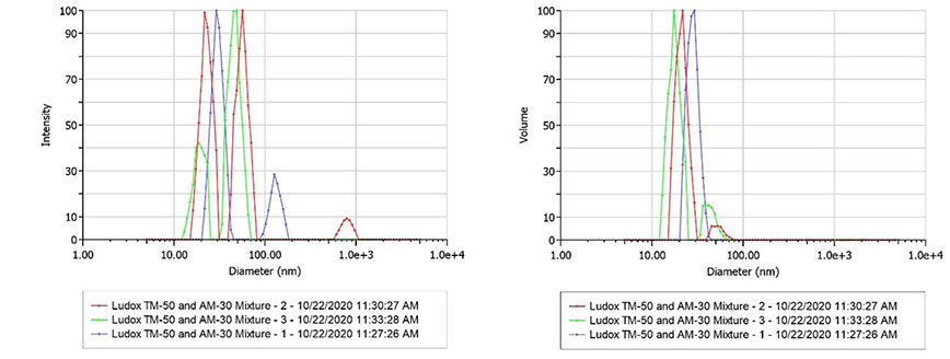 通過查看對 Ludox TM – 50 與 AM – 30 混合物的三次測量結果,可以在未經轉換的光強加權分布中(圖 1)清晰地識別出兩個顆粒群。我們還注意到,當采用體積加權時,兩個峰中較大的峰被抑制,從而突出了較大顆粒豐度較低這一情況。