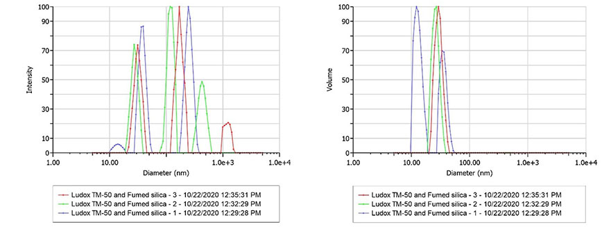 相比之下,當我們將 Ludox TM – 50 與氣相二氧化硅混合(圖 2)時,由于氣相二氧化硅的分形結構,它的顆粒形態遠沒有那么規整,盡管只有兩種成分存在,但分布卻顯得更加復雜。這個名義上的雙峰樣品在光強加權中呈現出一些低豐度的數據擬合偽影,分別位于在約 10 nm 和約 1000 nm 處。盡管這些偽影在光強加權分布中豐度較低(左圖),僅為實際測量信號中的次要成分,但當我們轉換為體積加權時(右圖),偽影被顯著放大。