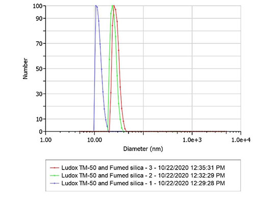 盲目地對多峰粒度分布進行重新歸一化存在風險,用戶最終可能會忽略最大組分的貢獻,同時過分強調較小的組分。顯然,當將 TM-50 與氣相二氧化硅混合時,這種效應在轉換為數量加權分布時進一步加劇(圖3),在三次測量的第一次測量中,它似乎成為唯一的峰,盡管它并不代表混合物中存在的任何一種顆粒。在極端情況下,這甚至可能意味著強調不存在的組分。